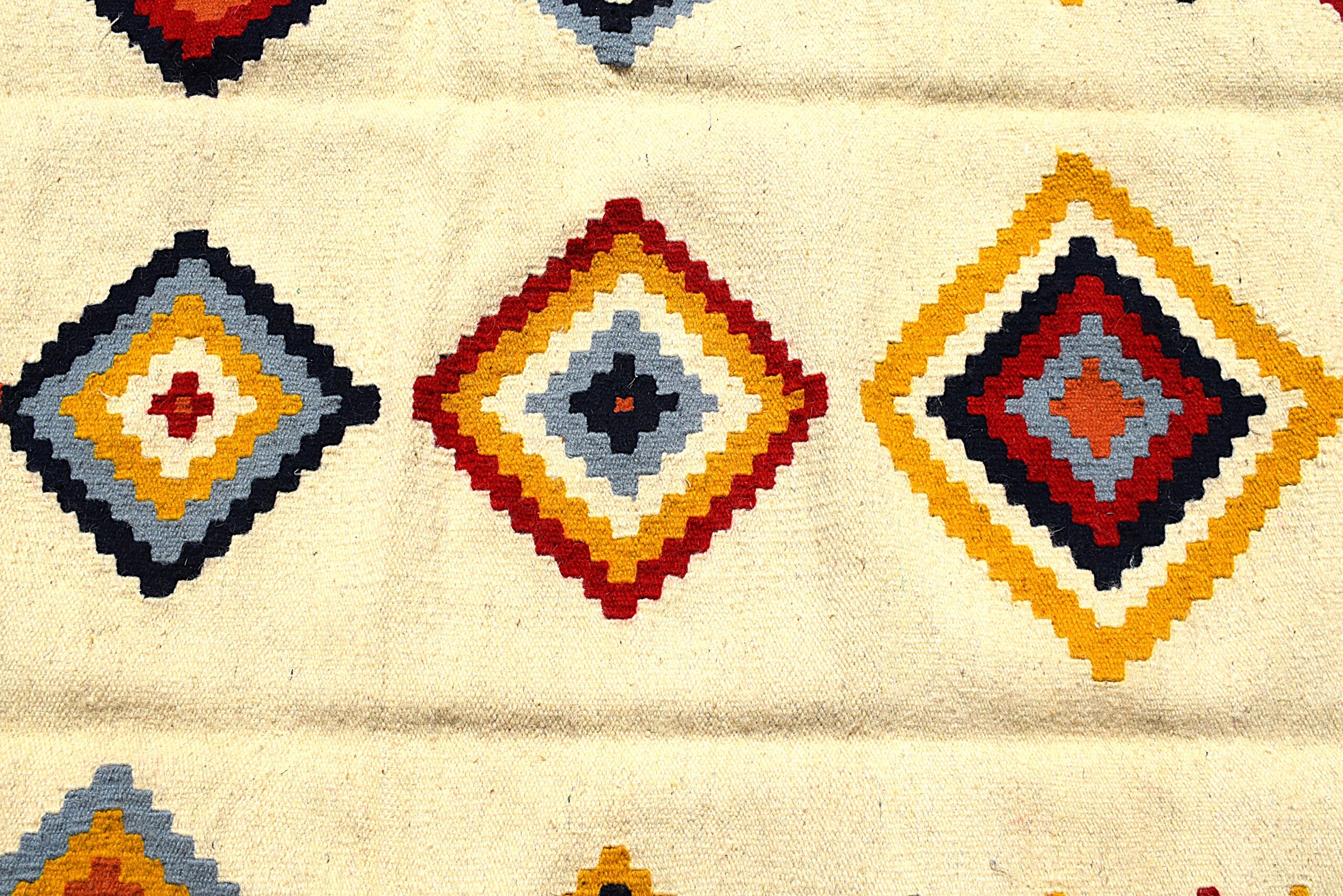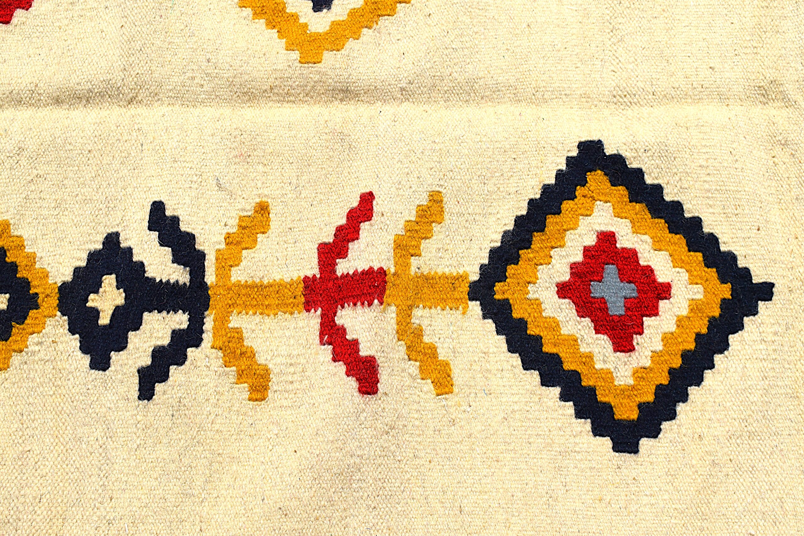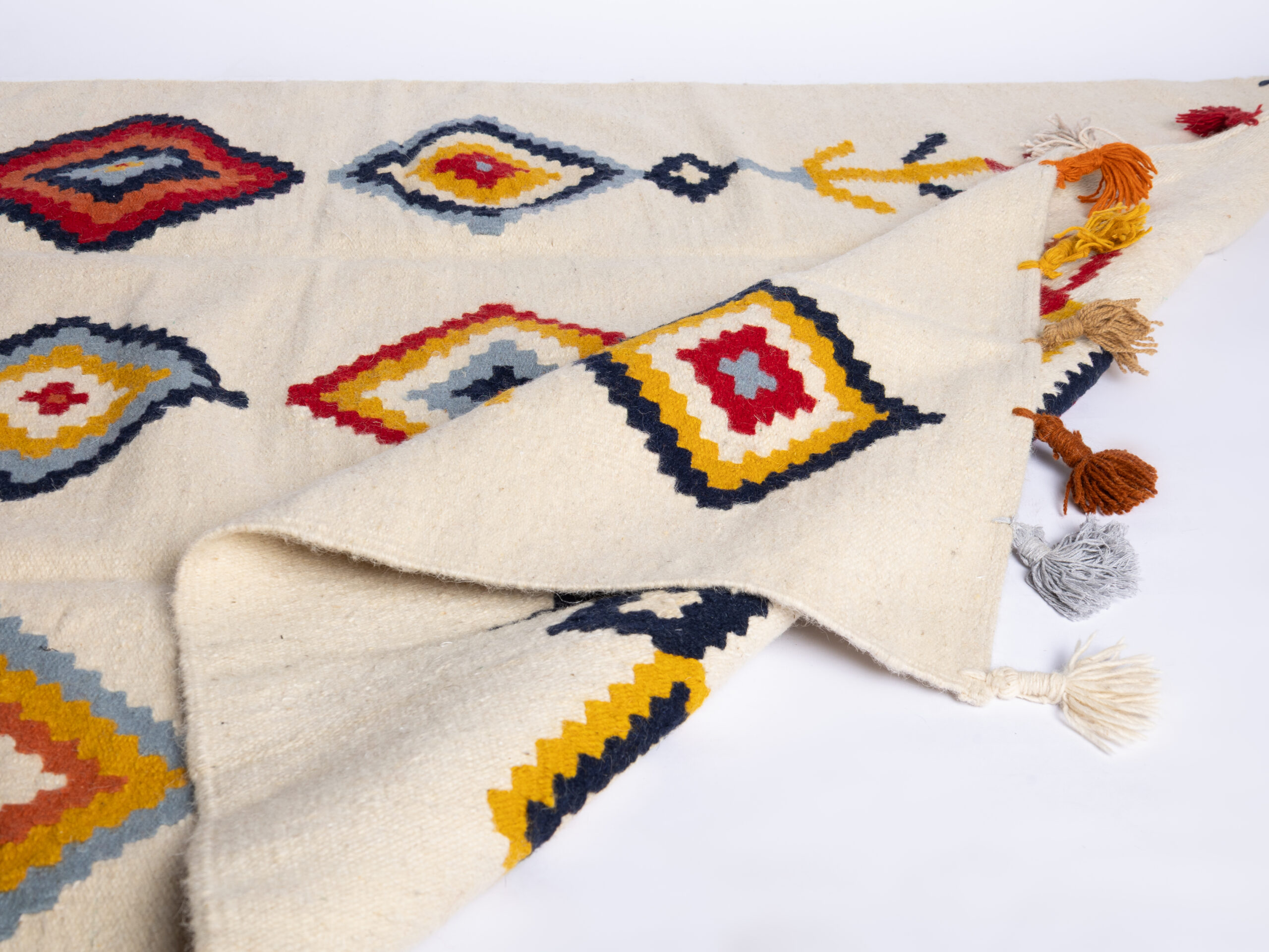 Set against a natural cream background, the bold, multicolored diamonds and arrows bring playful energy to any living space. Finished with tassels in matching colors, this flatweave rug adds warmth, texture, and authenticity to your home. Lightweight, durable, and versatile—perfect for living rooms, bedrooms, or creative studio spaces.
